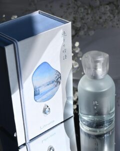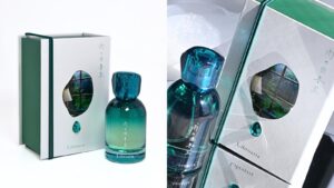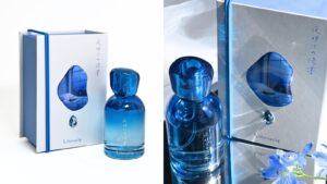 パッケージの中央には、水面に映る情景を切り取ったかのような立体的な装飾を配置。そこからこぼれ落ちた香りをイメージして、しずく型のストーンをあしらっている。